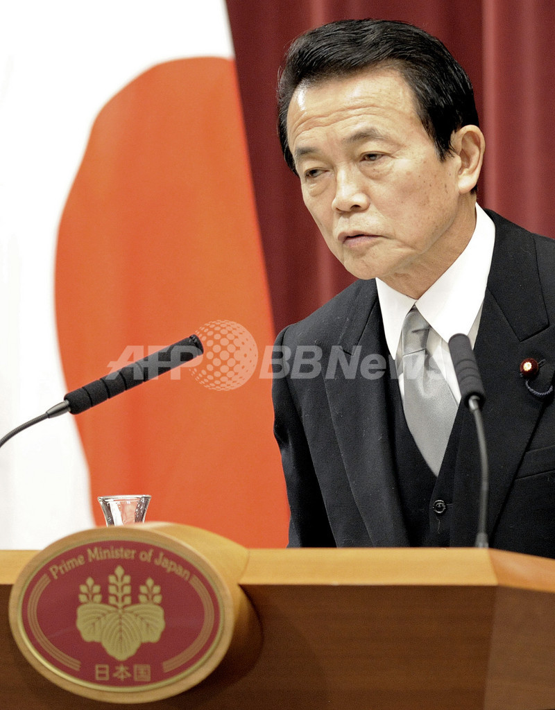 【1月4日 AFP】(写真追加)麻生太郎(Taro Aso)首相は4日午前、記者会見を行い、経済問題への対応と予算と関連法案の成立に集中する必要性を強調し、少なくとも数か月は解散・総選挙を行う考えがないと表明した。