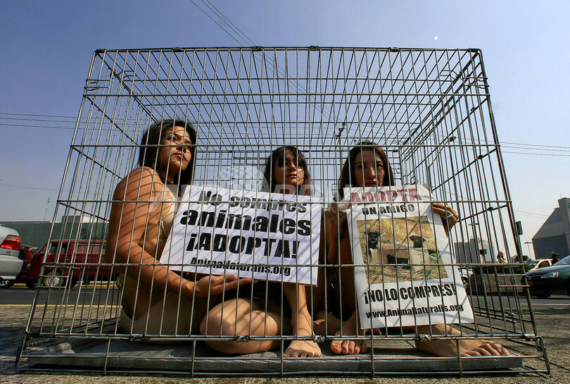 【1月5日 AFP】メキシコの首都メキシコ市(Mexico City)で3日、動物の権利擁護を訴える活動家たちが檻に入ってセミヌードになり、動物の売買や放棄に抗議した。「動物は買うな、引き取ろう」、「友人を引き取ろう」といったスローガンが掲げられた。