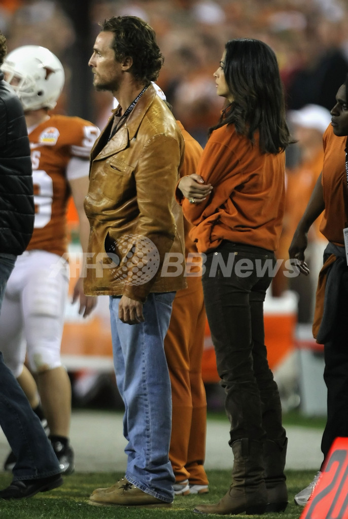 米アリゾナ(Arizona)州グレンデール(Glendale)のフェニックス大学スタジアム(University of Phoenix Stadium)で、カレッジフットボールの大会「Fiesta Bowl」のテキサス(Texas)大学ロングホーンズ(Longhorns)VSオハイオ(Ohio)大学バックアイズ(Buckeyes)の試合を観戦した、俳優のマシュー・マコノヒー(Matthew McConaughey、左)と恋人のカミラ・アルヴェス(Camila Alves、2009年1月5日撮影)。(c)AFP/Getty Images/Doug Pensinger