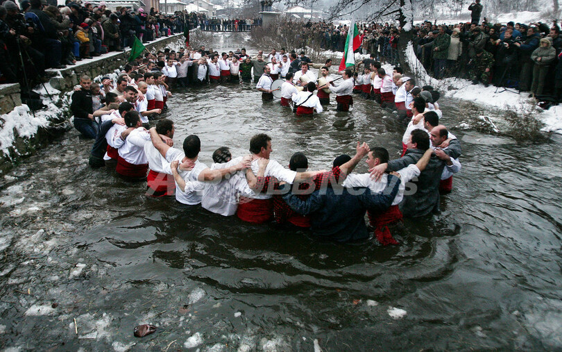ニュース ライフ 十字架めがけて氷張る湖にダイブ、新年の息災祈り ブルガリア 2009年1月7日 11:22 発信地:ソフィア/ブルガリア [ ヨーロッパ ブルガリア ] このニュースをシェア ‹ › ❮ 6/7 ❯ ブルガリアのソフィア(Sofia)から東に約200キロの町KaloferにあるTundzha川で、公現祭を祝って伝統舞踊を踊る男性(2009年1月6日撮影)。(c)AFP/BORYANA KATSAROVA 画像作成中 ! 【1月7日 AFP】キリスト教の「公現祭」の6日、東方正教会の司祭が湖に投げ入れた十字架を拾う行事がブルガリアのソフィア(Sofia)で行われた。最初に十字架をつかんだ者は1年間健康に過ごせるとされている。(c)AFP ライフ 一覧へ> メディア・報道関係・法人の方向け 写真・動画 購入のお問合せ>