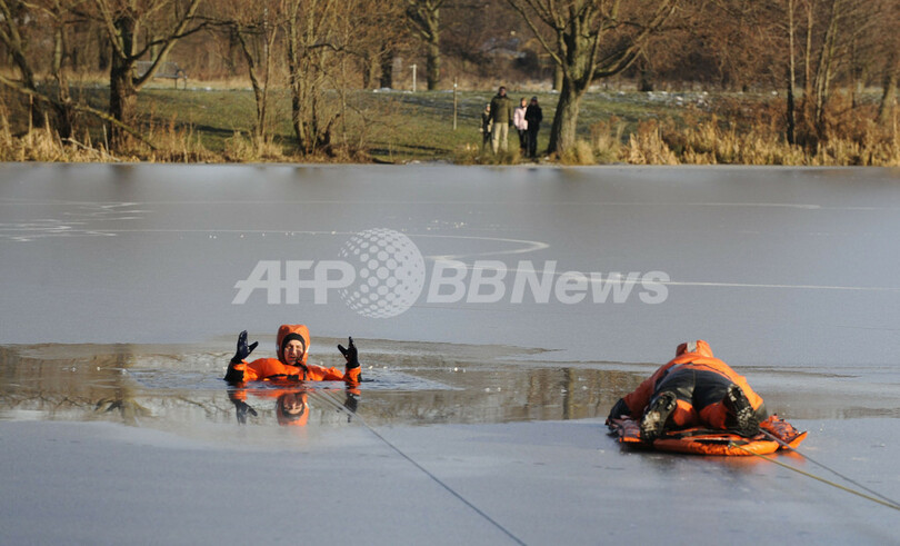 ドイツ・ハノーバー(Hanover)で行われた救助訓練で、湖に張った氷が割れて湖に落ちた人を演じる、地方自治体の消防隊員。寒波の襲来でニーダーザクセン(Lower Saxony)州の湖には氷が張っている。欧州の大半の国と同様、ドイツも寒波に襲われ、夜間の気温はマイナス26度にまで下がる(2009年1月6日撮影)。(c)AFP/DDP/NIGEL TREBLIN
