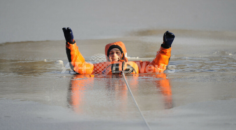 ドイツ・ハノーバー(Hanover)で行われた救助訓練で、湖に張った氷が割れて湖に落ちた人を演じる、地方自治体の消防隊員。寒波の襲来でニーダーザクセン(Lower Saxony)州の湖には氷が張っている。欧州の大半の国と同様、ドイツも寒波に襲われ、夜間の気温はマイナス26度にまで下がる(2009年1月6日撮影)。(c)AFP/DDP/NIGEL TREBLIN