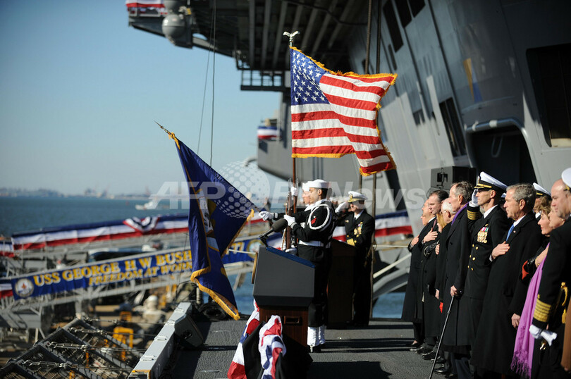 現大統領はあいさつで、第2次大戦中には海軍パイロット、1989-93年には大統領を務めた父親の業績をたたえ、「幸せな人生を歩み、望むものはほぼすべて手に入れてきた男に何を贈るべきかと考えた末、空母を思いついた」と述べた。