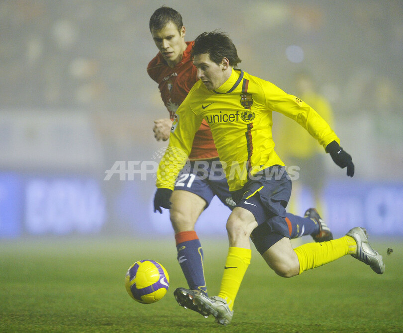 【1月12日 AFP】08-09スペイン1部リーグ第18節、オサスナ(CA Osasuna)対FCバルセロナ(FC Barcelona)。試合は後半39分にリオネル・メッシ(Lionel Messi)が決勝点を決めてバルセロナが3-2で最下位オサスナを下した。首位に立つバルセロナと2位のレアル・マドリード(Real Madrid)との勝ち点差は12のまま。