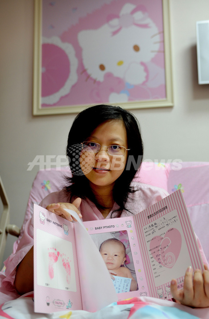 台湾中部の彰化(Changhua)県員林(Yuanlin)にある病院「皓生(Hau Sheng)醫院」は、サンリオ(Sanrio)のハローキティ(Hello Kitty)をテーマにしている。この病院では、過去2年間に2000人以上の赤ちゃんが誕生している。写真は、子どもの写真を見せる母親(2009年1月14日撮影)。(c)AFP/Sam YEH
