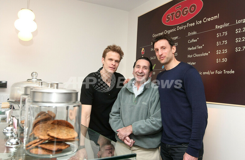 米ニューヨーク(New York)のアイスクリーム店「Stogo Ice Cream Shop」でポーズをとる、女優キーラ・セジウィック(Kyra Sedgwick)の弟で同店共同設立者の俳優ロバート・セジウィック(Robert Sedgwick、左)とSteve Horn氏(右)、設立者のMalcolm Stogo氏(2009年1月14日撮影)。(c)AFP/Getty Images/Michael Loccisano