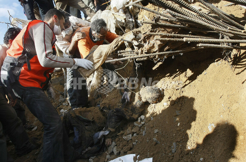 パレスチナ自治区ガザ地区(Gaza Strip)のガザ市(Gaza City)で、イスラエル軍の攻撃で破壊された建物のがれきの中から遺体を収容する人びと。イスラエル軍の撤退開始を受け、ガザ地区では人々が自宅へと帰還し始めた。医療関係者らによると、がれきの中から19日朝までに新たに子どもを含む95人の遺体が発見され、22日間にわたる一連の攻撃での死者数は1300人を超えた(2009年1月18日撮影)。(c)AFP/MAHMUD HAMS