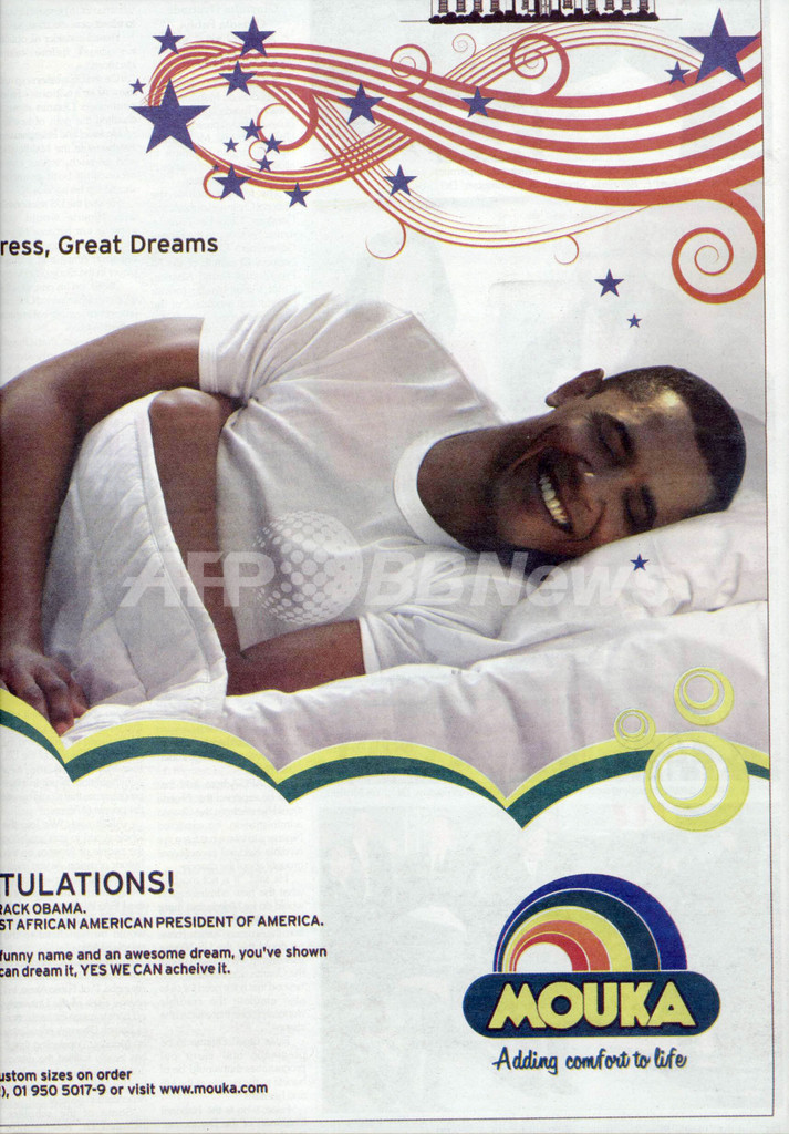 【1月21日 AFP】ナイジェリアのマットレス製造会社「Mouka」は、20日の米大統領就任式にあやかり、バラク・オバマ(Barack Obama)新大統領がマットレスの上でうたたねしている合成写真を使った全面広告を国内各紙に掲載した。