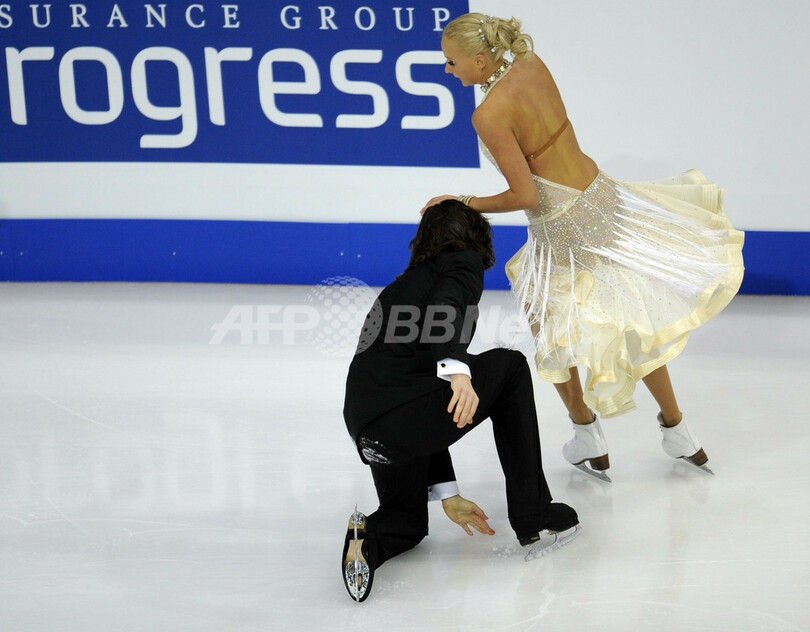 フィギュアスケート09欧州選手権(%%ISU European Figure Skating Championships 2009%%)、アイスダンス・コンパルソリーダンス(規定、CD)で33.53点を記録し5位につけたロシアのオクサナ・ドムニナ(%%Oksana Domnina%%、右)とマキシム・シャバリン(%%Maxim Shabalin%%)。(2009年1月20日撮影)(c)AFP/OLIVIER MORIN