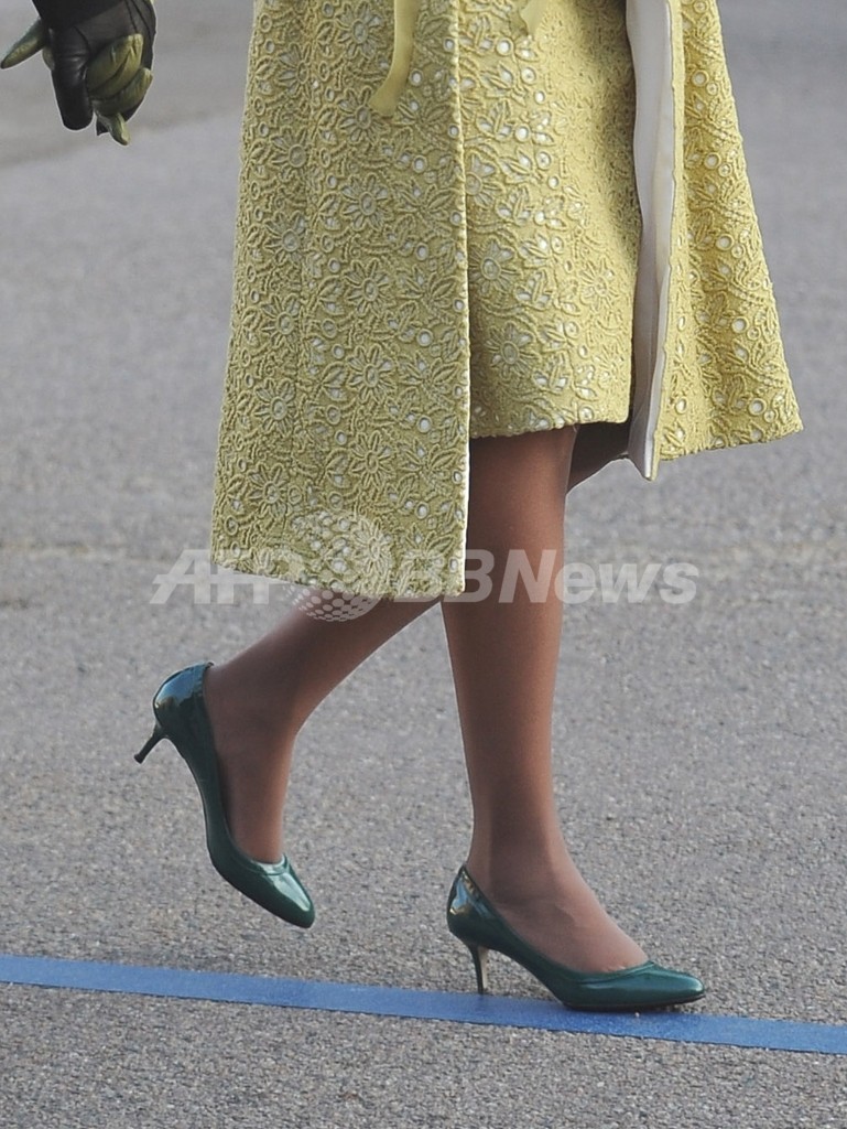 ドレスに合わせた深いグリーンのパテントレザーパンプスは「ジミー チュウ(JIMMY CHOO)」。ソフトグリーンのレザーグローブは「ジェイ・クルー(J. Crew)」だった。