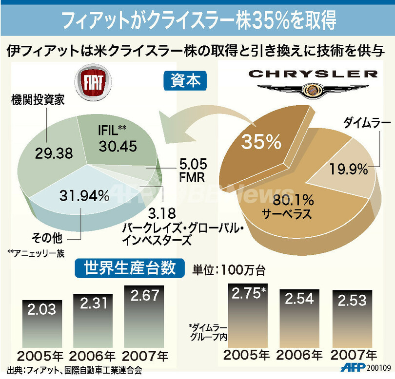 ニュース 政治・経済 図解 【図解】フィアットがクライスラー株35%を取得 2009年1月21日 17:16 発信地:イタリア [ ヨーロッパ イタリア ] このニュースをシェア (c)AFP 【1月21日 AFP】イタリア自動車大手フィアット(Fiat)は米自動車大手クライスラー(Chrysler)株の35%を取得する方向で同社と基本合意に達した。図は、2社の株式と生産台数について示したもの。(c)AFP<ニュース解説画像一覧へ> 政治・経済 一覧へ> メディア・報道関係・法人の方向け 写真・動画 購入のお問合せ>