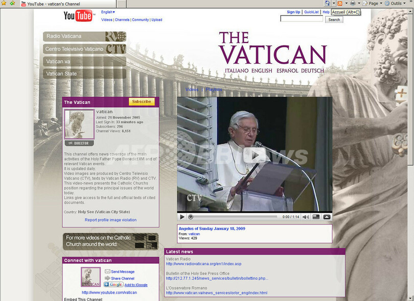 【1月24日 AFP】ローマ法王庁は23日、動画共有サイト「ユーチューブ(YouTube)」にローマ法王ベネディクト16世(Benedict XVI)の公式チャンネルを開設した。しかし注目度はあまり高くないようだ。