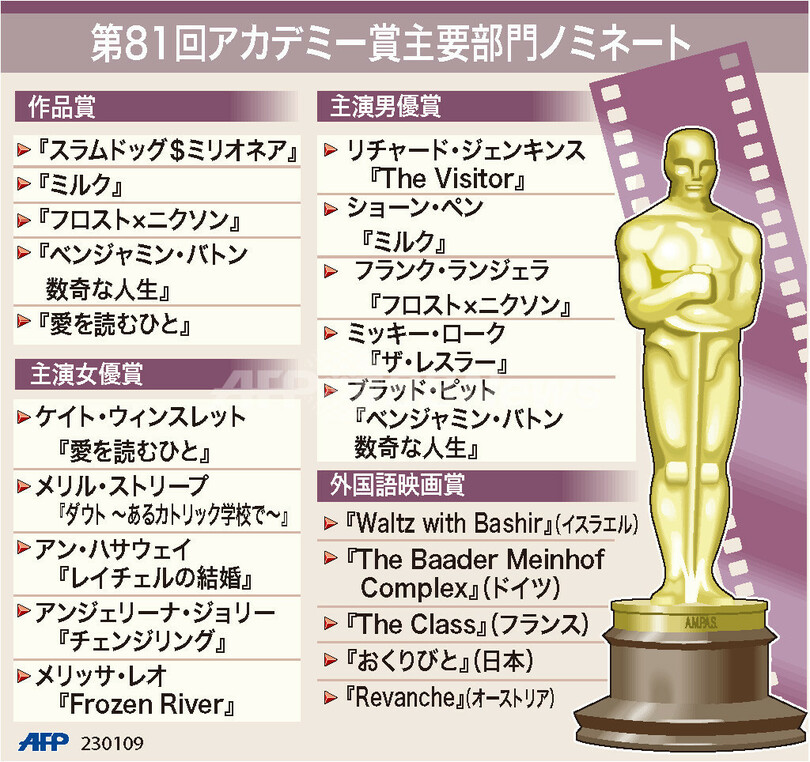 ニュース ライフ 図解 【図解】第81回アカデミー賞主要部門ノミネート 2009年1月24日 13:52 発信地:米国 [ 北米 米国 ] このニュースをシェア (c)AFP 【1月24日 AFP】図は、第81回アカデミー賞(Academy Awards)の主要部門ノミネート作品の一覧。(c)AFP<ニュース解説画像一覧へ> ライフ 一覧へ> メディア・報道関係・法人の方向け 写真・動画 購入のお問合せ>