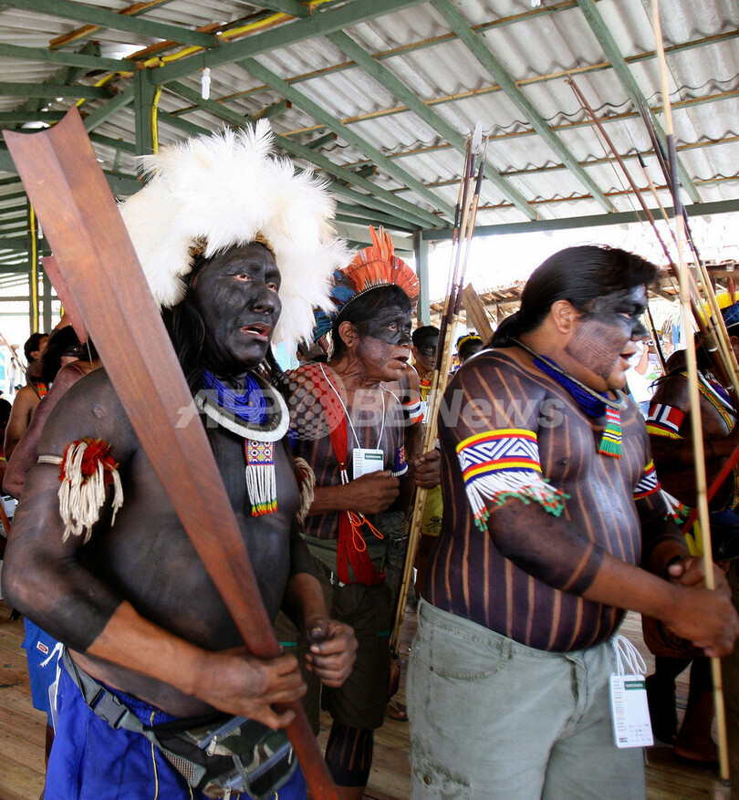 世界社会フォーラム(World Social Summit)開幕を翌日に控えた26日、ブラジル・パラ(Para)州ベレン(Belem)で、先住民の式典に参加したKaiapo族の人々。世界社会フォーラムはスイスのダボス(Davos)で開催される世界経済フォーラム(World Economic Forum)に対抗して行われている(2009年1月26日撮影)。(c)AFP/VANDERLEI ALMEIDA