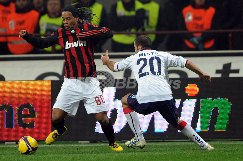 ミランは、4-1で勝利した25日のボローニャ(Bologna FC)戦で移籍後初得点を記録したデビッド・ベッカム(David Beckham)がフリーキック(FK)から直接ゴールを決めて先制するも、試合終了3分前にジェノアのディエゴ・ミリート(Diego Milito)に同点ゴールを許して勝利を逃し、首位インテル(Inter Milan)との勝ち点差は8に広がった。(c)AFP/Barnaby Chesterman