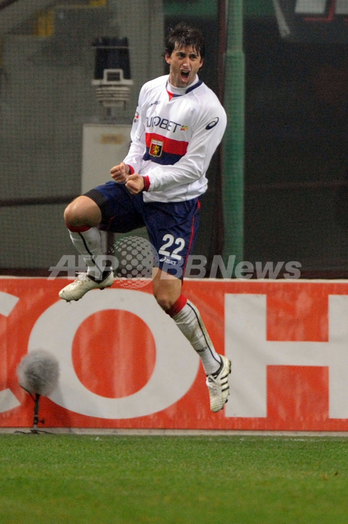 ミランは、4-1で勝利した25日のボローニャ(Bologna FC)戦で移籍後初得点を記録したデビッド・ベッカム(David Beckham)がフリーキック(FK)から直接ゴールを決めて先制するも、試合終了3分前にジェノアのディエゴ・ミリート(Diego Milito)に同点ゴールを許して勝利を逃し、首位インテル(Inter Milan)との勝ち点差は8に広がった。(c)AFP/Barnaby Chesterman