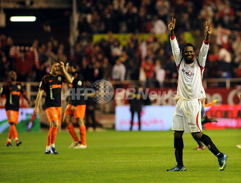 【1月30日 AFP】サッカースペイン国王杯(Copa del Rey 2008-09)準々決勝、セビージャFC(Sevilla FC)対バレンシア(Valencia CF)第2戦。試合はセビージャが2-1で勝利し、バレンシアが3-2で勝利した第1戦との2試合合計スコアは4-4の同点となったが、アウェーゴールで上回ったセビージャが準決勝進出を決めた。セビージャは準決勝でアスレティック・ビルバオ(Athletic Bilbao)と対戦する。(c)AFP