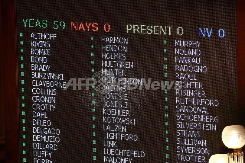 【1月30日 AFP】(写真追加)米イリノイ(Illinois)州議会は29日、バラク・オバマ(Barack Obama)米大統領の後任上院議員の指名をめぐる不正容疑で逮捕されたロッド・ブラゴジェビッチ(Rod Blagojevich)州知事の弾劾裁判で、59対0の満場一致で罷免を承認した。