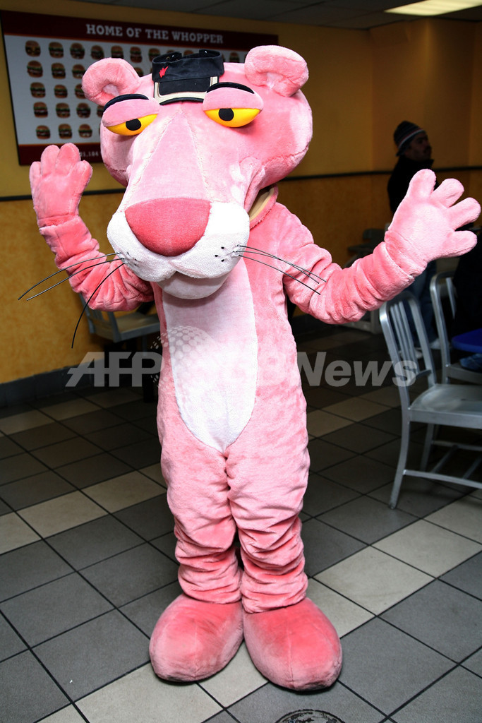 ニューヨーク(New York)の米大手ハンバーガーチェーン、バーガーキング(Burger King)に登場し、フレッシュ・アップル・フライ(Fresh Apple Fries)をPRしたピンクパンサー(Pink Panther、2009年1月29日撮影)。(c)AFP/Getty Images/Astrid Stawiarz