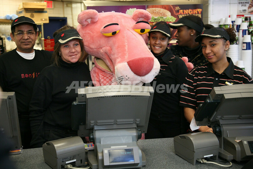 ニューヨーク(New York)の米大手ハンバーガーチェーン、バーガーキング(Burger King)に登場し、フレッシュ・アップル・フライ(Fresh Apple Fries)をPRしたピンクパンサー(Pink Panther、2009年1月29日撮影)。(c)AFP/Getty Images/Astrid Stawiarz