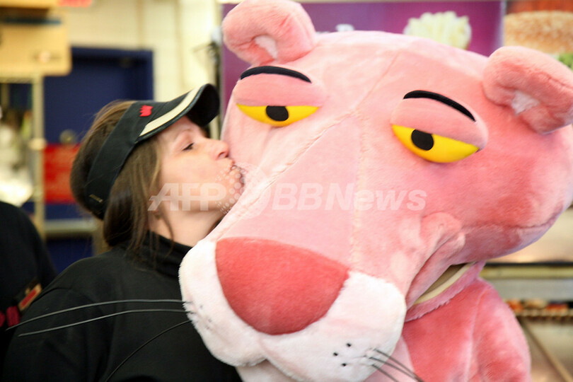 ニューヨーク(New York)の米大手ハンバーガーチェーン、バーガーキング(Burger King)に登場し、フレッシュ・アップル・フライ(Fresh Apple Fries)をPRしたピンクパンサー(Pink Panther、2009年1月29日撮影)。(c)AFP/Getty Images/Astrid Stawiarz