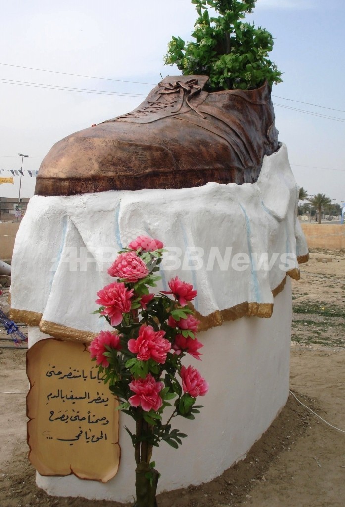 故サダム・フセイン(Saddam Hussein)元大統領の故郷ティクリート(Tikrit)に完成し、29日に一般公開されたばかりの靴の像は、高さ3メートルで、中に低木の茂み(bush)が植えられ白い台座の上に置かれていた。イラク人アーティストLaith al-Ameri氏が製作した。