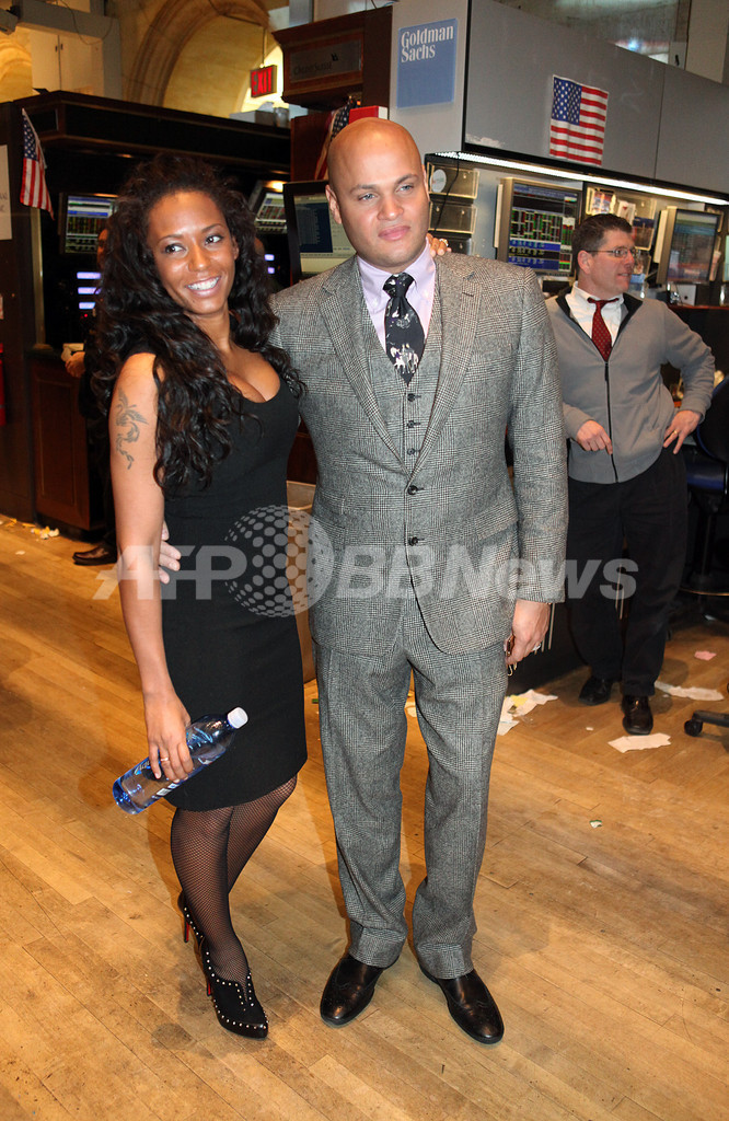 英人気ポップ・グループ「スパイス・ガールズ(Spice Girls)」のメンバー、メル・B(Mel B)ことメラニー・ブラウン(Melanie Brown、左)。夫で音楽プロデューサーのスティーヴン・ベラフォンテ(Stephen Belafonte、右)とニューヨーク証券取引所(New York Stock Exchange、NYSE)を訪れ、クロージングベルを鳴らした(2009年2月2日撮影)。(c)AFP/Getty Images/Scott Gries