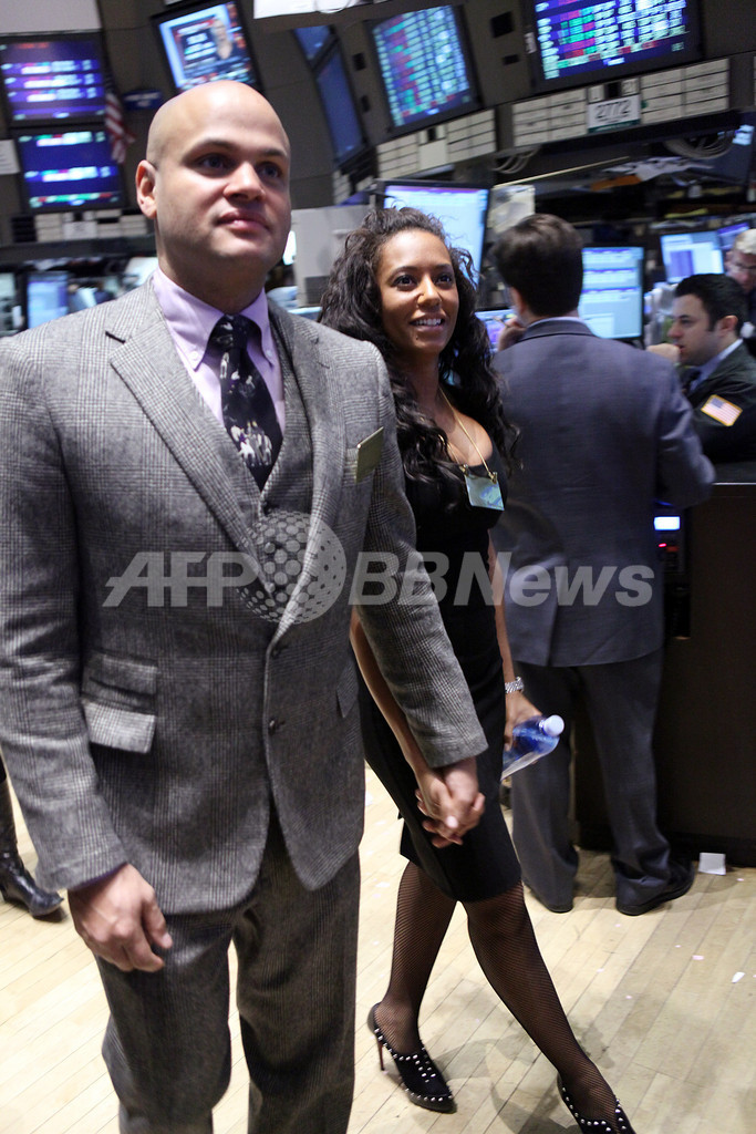 英人気ポップ・グループ「スパイス・ガールズ(Spice Girls)」のメンバー、メル・B(Mel B)ことメラニー・ブラウン(Melanie Brown、右)。夫で音楽プロデューサーのスティーヴン・ベラフォンテ(Stephen Belafonte、左)とニューヨーク証券取引所(New York Stock Exchange、NYSE)を訪れ、クロージングベルを鳴らした(2009年2月2日撮影)。(c)AFP/Getty Images/Scott Gries