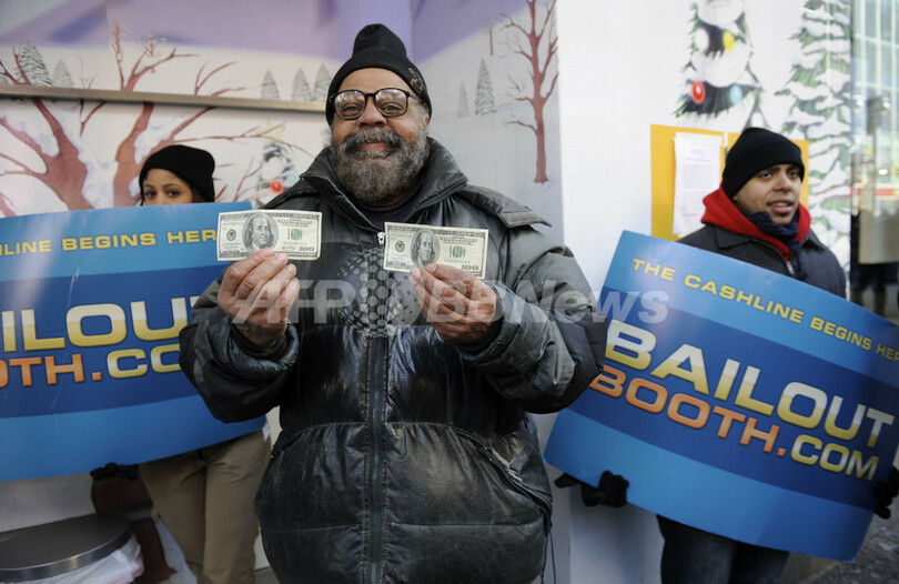 ベイルアウト・ビルは、黒いサングラスをかけ、ニットキャップを目深にかぶり、人びとに最低50ドル(約4500円)、時にはもっと高額の現金を手渡す。ニューヨークは4日、気温0度を下回る寒さだったが、ブースの前には数百人が列をつくり、5時間以上も並ぶ人も出た。多くは景気悪化の影響を受けた人びとだ。一連の経済危機で、ニューヨークだけでも数万人が職を失っている。
