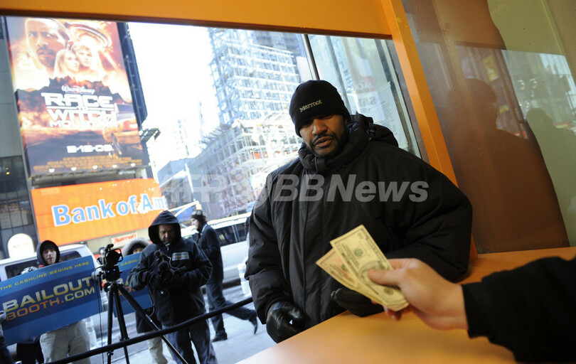 ベイルアウト・ビルは、黒いサングラスをかけ、ニットキャップを目深にかぶり、人びとに最低50ドル(約4500円)、時にはもっと高額の現金を手渡す。ニューヨークは4日、気温0度を下回る寒さだったが、ブースの前には数百人が列をつくり、5時間以上も並ぶ人も出た。多くは景気悪化の影響を受けた人びとだ。一連の経済危機で、ニューヨークだけでも数万人が職を失っている。