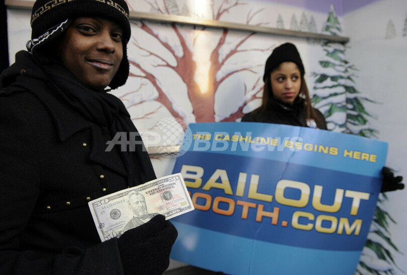 【2月5日 AFP】(写真追加)彼は名前も名乗らないし、顔も見せない。ただニューヨーク(New York)の真ん中で人びとに現金を渡すだけ――。ニューヨーク・タイムズスクエア(Times Square)で4日、「ベイルアウト・ビル(『救済家ビル』、Bailout Bill)」なる人物が登場し、「救済ブース(Bailout Booth)」と名付けられたブースの中から人びとに現金を配った。
