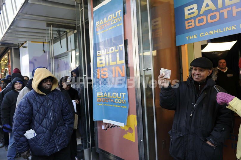 ベイルアウト・ビルは、黒いサングラスをかけ、ニットキャップを目深にかぶり、人びとに最低50ドル(約4500円)、時にはもっと高額の現金を手渡す。ニューヨークは4日、気温0度を下回る寒さだったが、ブースの前には数百人が列をつくり、5時間以上も並ぶ人も出た。多くは景気悪化の影響を受けた人びとだ。一連の経済危機で、ニューヨークだけでも数万人が職を失っている。