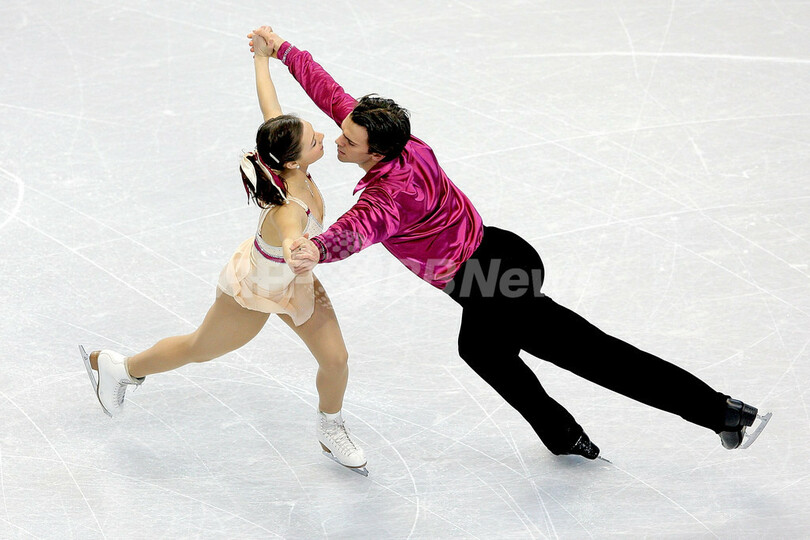 フィギュアスケート四大陸選手権2009(%%ISU Four Continents Figure Skating Championships 2009%%)ペア・ショートプログラム(SP)、64.36点を記録し2位につけたカナダのジェシカ・デュベ(%%Jessica Dube%%、左)とブライス・ダヴィソン(%%Bryce Davison%%)。(2009年2月4日撮影)(c)AFP/Getty Images/Matthew Stockman