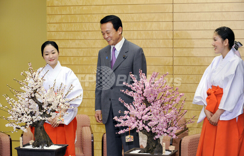 ニュース ライフ こぼれ話 麻生首相に紅白の梅プレゼント、太宰府から「梅の使節」 2009年2月6日 17:20 発信地:東京 [ アジア・オセアニア 東京 ] このニュースをシェア ‹ › ❮ 2/2 ❯ 都内の首相官邸で、首相官邸で福岡県太宰府天満宮の「梅の使節」の巫女(みこ)から紅白の梅の鉢を贈られる麻生太郎(Taro Aso)首相(中央、2009年2月5日撮影)。(c)AFP/Yoshikazu TSUNO 画像作成中 ! 【2月6日 AFP】麻生太郎(Taro Aso)首相は5日、首相官邸で福岡県太宰府天満宮の「梅の使節」の巫女(みこ)の表敬を受け、紅白の梅の鉢を贈られた。福岡県は麻生首相の地元。(c)AFP ライフ 一覧へ> メディア・報道関係・法人の方向け 写真・動画 購入のお問合せ>