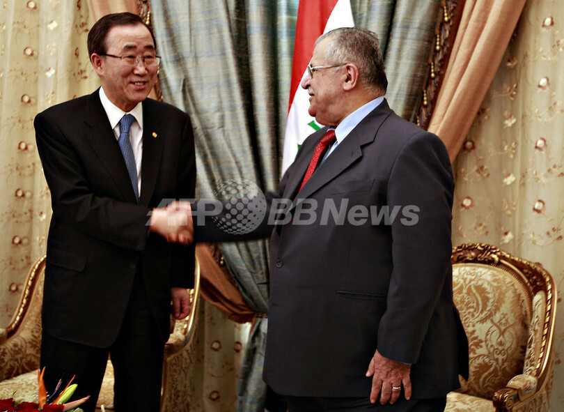 潘事務総長はバグダッド到着直後、ジャラル・タラバニ(Jalal Talabani)大統領とも会談を行った。(c)AFP/Benjamin Morgan
