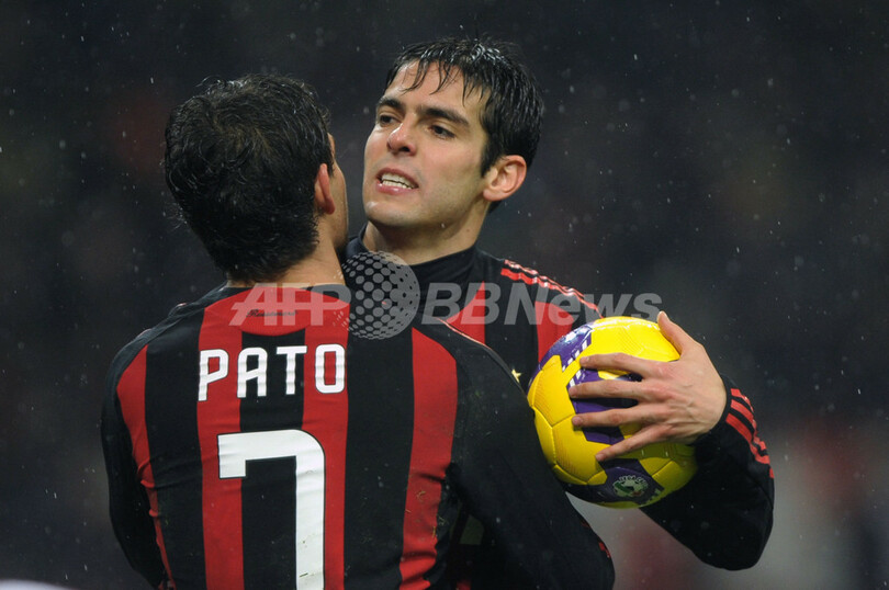 ミランは、ダヴィデ・ディ・ジェンナーロ(Davide Di Gennaro)にゴールを決められて先制点を許したが、カカ(Kaka)が後半22分にペナルティーキック(PK)決めて同点に追いついた。(c)AFP/Barnaby Chesterman