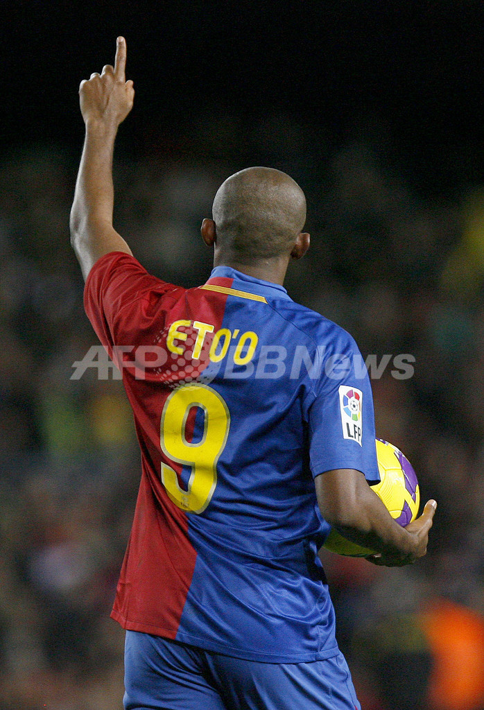 前半23分と同40分にゴールを決めたエトーは、リーグ戦での得点数を21に伸ばし、17得点で2位につけるバレンシア(Valencia CF)のダビド・ビジャ(David Villa)との差を広げた。(c)AFP/Phil Seery