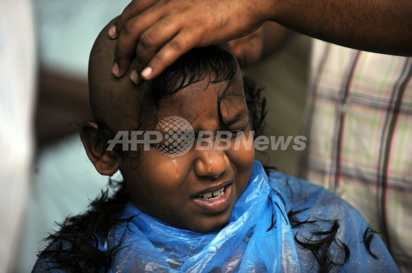 マレーシアのクアラルンプール(Kuala Lumpur)で8日、ヒンズー教の奇祭「タイプーサム(Thaipusam)」が行われた。この祭りは、ムルガ(Muruga)神が母親である女神パールヴァティ(Pavarthi)から無敵の槍を与えられ、悪魔を倒した日を記念するもので、マレーシアに暮らす約200万人のインド系住民が参加する。写真は、鍾乳洞バトゥ・ケイブ(Batu Caves)にある寺院で、髪の毛を剃られ泣き出す男の子(2009年2月8日撮影)。(c)AFP/Saeed KHAN