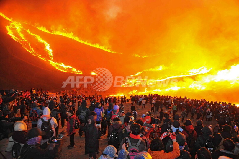 【2月10日 AFP】(写真追加)韓国・昌寧(Changnyeong)にある火旺(Hwawang)山で9日、旧正月明けの初めての満月に合わせた恒例の山焼き行事の最中に、風にあおられ勢いを増した火の手から逃げようとして見物客がパニックとなり、少なくとも4人ががけから落ちて死亡し、35人が負傷した。地元警察が明らかにした。