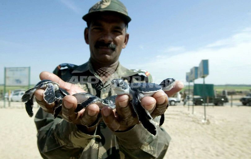 インド・グジャラート(Gujarat)州のMadhavpur海岸で9日、インドの陸軍、海軍、空軍が合同軍事演習「Exercise Tropex-2009」を行った。写真は、演習の合間にウミガメの赤ちゃんを手にする陸軍兵士(2009年2月9日撮影)。(c)AFP/Sam PANTHAKY
