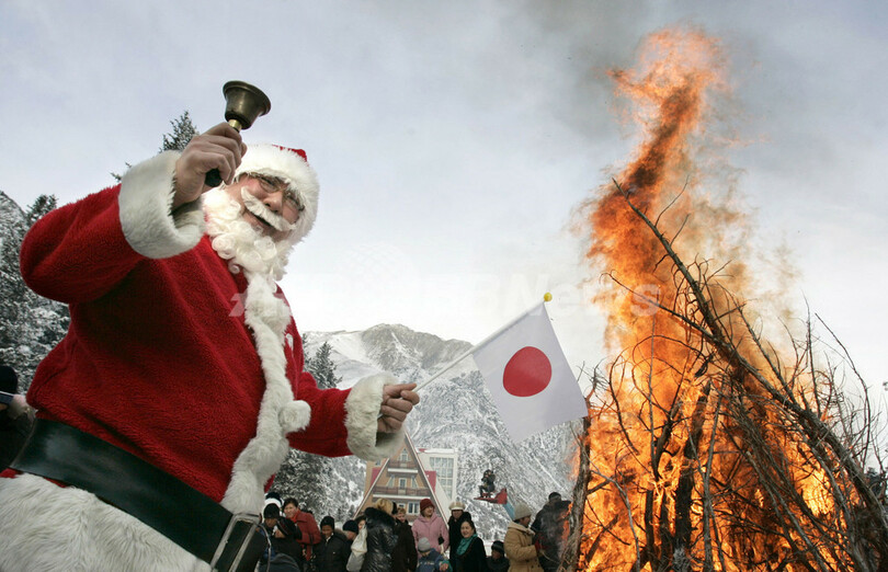 キルギスの都市カラコル(Karakol)で、「国際サンタクロースフェスティバル(International Santa Claus Festival)が開催され、英国、デンマーク、スウェーデン、ノルウェー、米国、カナダ、日本など多くの国からサンタクロースが参加した。写真は日本から参加しベルを鳴らすパラダイス山元(Paradis Yamamoto)さん。(2009年2月8日撮影)。(c)AFP/VYACHESLAV OSELEDKO