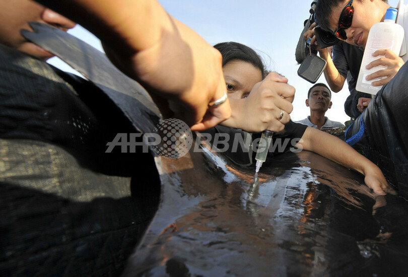 水産当局者は当初地元ラジオとテレビ局に対し、座礁しているのはイルカだとしたが、ほかの専門家らはAFPに対し、カズハゴンドウだと語った。獣医師によると、カズハゴンドウは「体の大きさや歯から、イルカと間違われることが多い」と語っている。(c)AFP/Cecil Morella