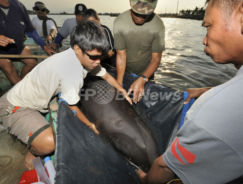 水産当局者は当初地元ラジオとテレビ局に対し、座礁しているのはイルカだとしたが、ほかの専門家らはAFPに対し、カズハゴンドウだと語った。獣医師によると、カズハゴンドウは「体の大きさや歯から、イルカと間違われることが多い」と語っている。(c)AFP/Cecil Morella