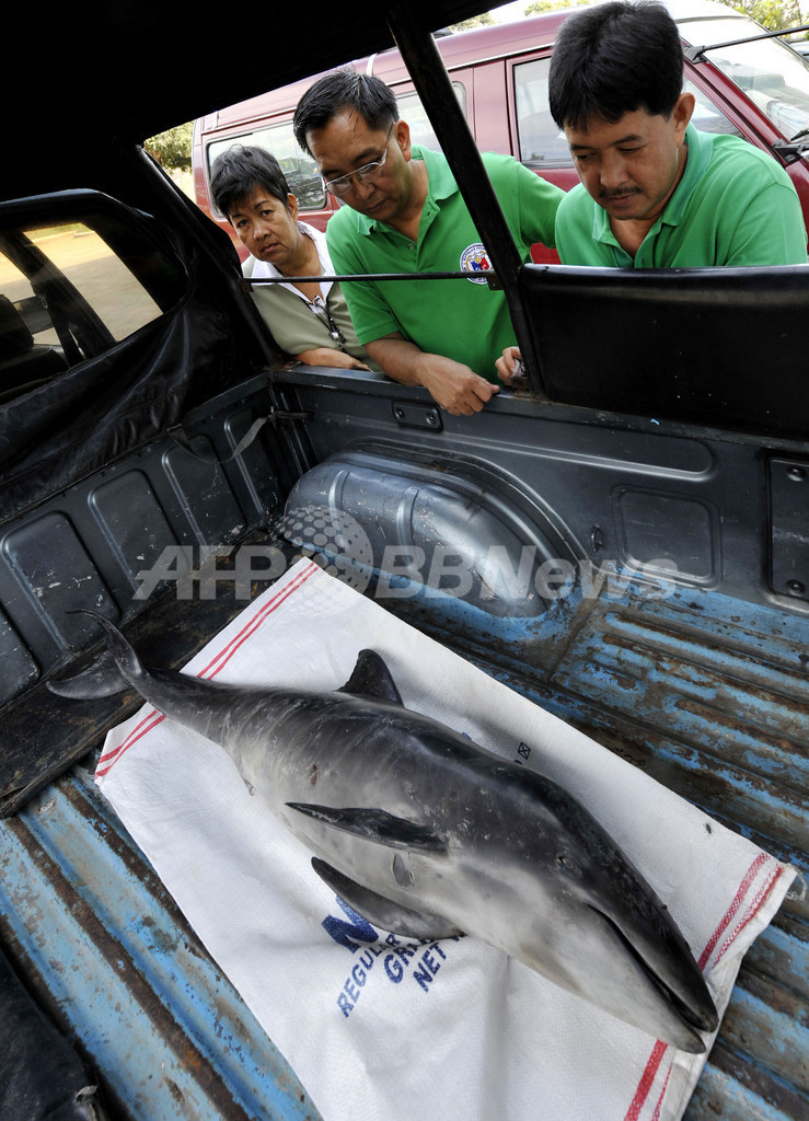 水産当局者は当初地元ラジオとテレビ局に対し、座礁しているのはイルカだとしたが、ほかの専門家らはAFPに対し、カズハゴンドウだと語った。獣医師によると、カズハゴンドウは「体の大きさや歯から、イルカと間違われることが多い」と語っている。(c)AFP/Cecil Morella