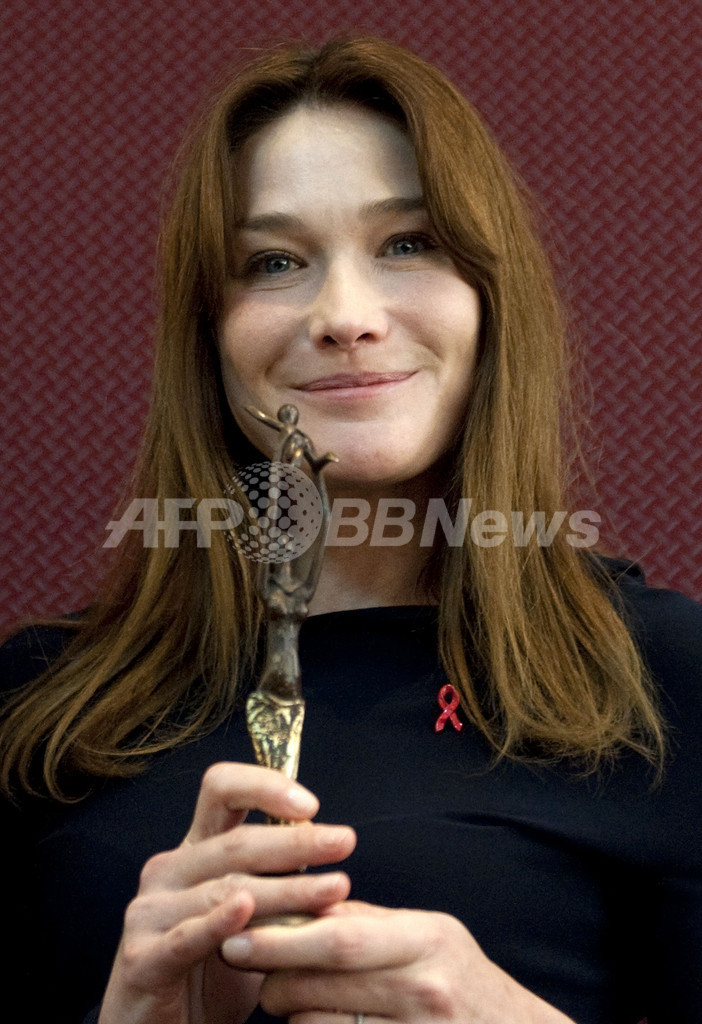 仏大統領夫人のカーラ・ブルーニ(Carla Bruni)さんは、世界エイズ・結核・マラリア対策基金(Global Fund to Fight AIDS, Tuberculosis and Malaria)の親善大使として初の各国歴訪で最終地ブルキナファソを訪れた。カーラ夫人は同国のブレーズ・コンパオレ(Blaise Campaore)大統領夫妻と会談。その後に開かれたエイズ対策委員会CNLSの会議で「ブルキナファソはエイズとの闘いに成功した一例」と語った。写真は首都ワガドゥグ(Ouagadougou)でエイズ基金から贈られた母子像を見せるカーラ夫人(2009年2月11日撮影)。(c)AFP/Philippe Wojazer