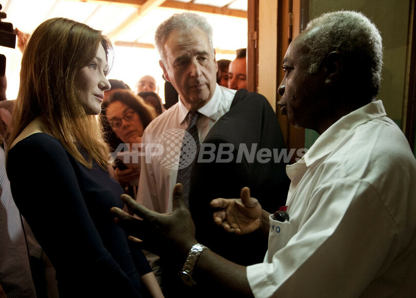 仏大統領夫人のカーラ・ブルーニ(Carla Bruni)さんは、世界エイズ・結核・マラリア対策基金(Global Fund to Fight AIDS, Tuberculosis and Malaria)の親善大使として初の各国歴訪で最終地ブルキナファソを訪れた。カーラ夫人は同国のブレーズ・コンパオレ(Blaise Campaore)大統領夫妻と会談。その後に開かれたエイズ対策委員会CNLSの会議で「ブルキナファソはエイズとの闘いに成功した一例」と語った。写真は首都ワガドゥグ(Ouagadougou)市内の病院を訪れ医師らと語るカーラ夫人(2009年2月11日撮影)。(c)AFP/Philippe Wojazer