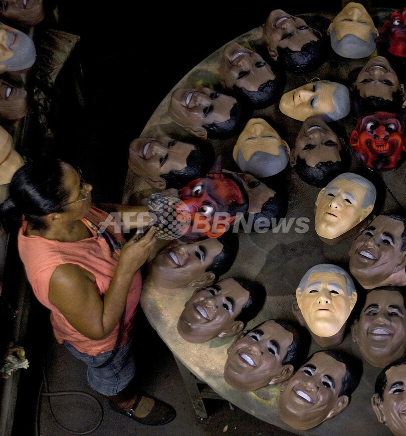 ニュース ライフ リオのカーニバル、オバマ米大統領のマスクが大人気に 2009年2月12日 19:37 発信地:サン・ゴンサーロ/ブラジル [ 中南米 ブラジル ] このニュースをシェア ‹ › ❮ 2/8 ❯ ブラジル最大の祭典リオのカーニバルの開始まで約10日、今年はバラク・オバマ(Barak Obama)米大統領のマスクが人気を呼んでいる。写真はリオデジャネイロ(Rio de Janeiro)の北方75キロのサン・ゴンサーロ(Sao Goncalo)にあるマスク工場で、オバマ大統領のマスクをチェックする従業員。この工場は年間3万個のカーニバル用マスクを製造。今年はすでにオバマ大統領のマスク5000個を欧州に輸出したという(2009年2月10日撮影)。(c)AFP/Antonio Scorza 画像作成中 ! 【2月12日 AFP】ブラジル最大の祭典リオのカーニバルまで約1週間、今年はバラク・オバマ(Barak Obama)米大統領のマスクが人気を呼んでいる。(c)AFP ライフ 一覧へ> メディア・報道関係・法人の方向け 写真・動画 購入のお問合せ>