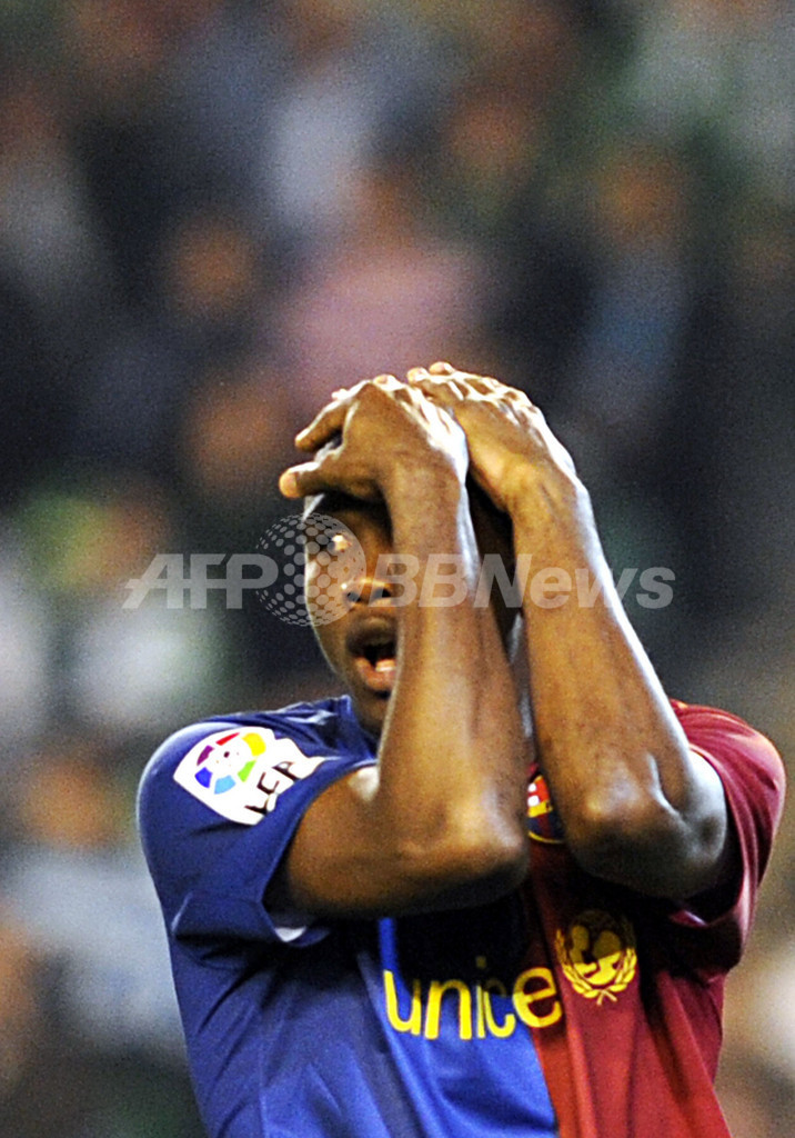 2点をリードされたバルセロナは、前半終了間際にエトーの得点で1点を返すと、試合終了6分前に再びエトーがシーズン23得点目となる同点ゴールを決めたが、バルセロナのリーグ戦での連勝は10で止まった。(c)AFP/Phil Seery
