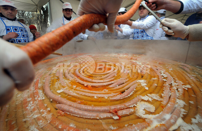 ギネス世界記録(Guinness World Record)によると、現時点でソーセージの長さの世界記録は前年12月にルーマニアで記録された392メートルだという。(c)AFP