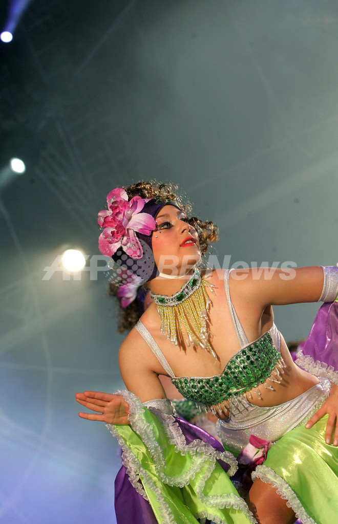 スペイン・カナリア(Canary)諸島テネリフェ(Tenerife)島で、サンタクルス・デ・テネリフェ(Santa Cruz de Tenerife)のカーニバルに参加したダンサー(2009年2月14日撮影)。(c)AFP/Desiree Martin